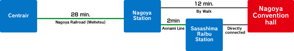 3. Take a Meitetsu airport bus, “Centrair Limousine,” from Chubu Centrair International Airport to Nagoya Station, get a taxi or walk to Nagoya Conventional Hall, or take Aonami Line train to Sasashima Raibu Station, which is connected to Nagoya Convention Hall.